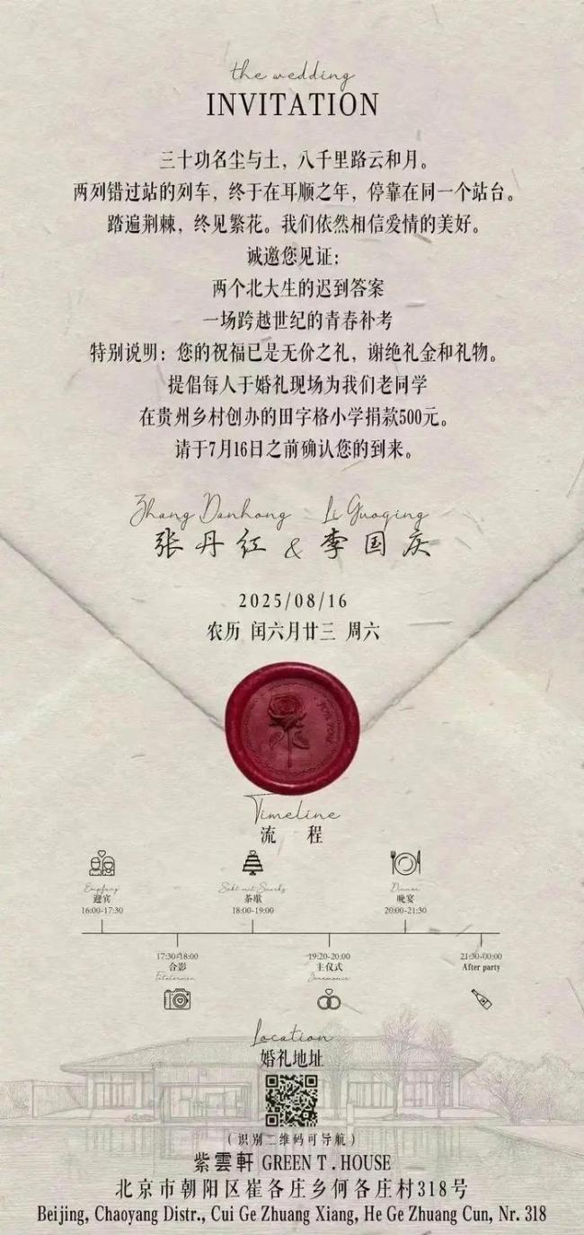 李国庆将再婚 女方为北大校友张丹红 婚礼结合公益倡导捐款!6月18日,网传一张结婚请柬显示,当当网创始人李国庆将于8月16日举办婚礼。新娘是他的北大校友、德籍华人张丹红。两人决定将婚礼与公益结合,谢绝礼金并倡导宾客为贵州田字格小学捐款500元。今年5月,他们一同参加了田字格公益举办的“暴走”活动,而李国庆是该公益组织的理事。媒体向李国庆求证此事,但尚未得到回应,不过接近他的人士已确认了婚讯。