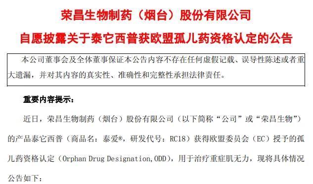 荣昌生物在财报中指出,中国B细胞介导自身免疫疾病市场巨大,全球自身免疫领域市场广阔,产品海外市场增长空间巨大,泰它西普将有望成为主要竞争者。目前,荣昌生物已在美国开展泰它西普用于治疗重症肌无力的Ⅲ期临床研究。日前,泰它西普亦获得欧盟委员会(EC)授予的孤儿药资格认定(ODD),用于治疗重症肌无力。