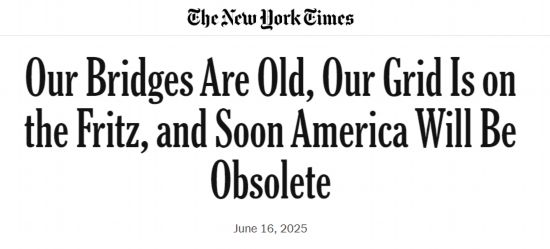 《纽约时报》6月16日刊发专栏文章称,美国的桥梁、电网和港口等基础设施正面临严重的老化与不足,美国即将被“老化淘汰”。