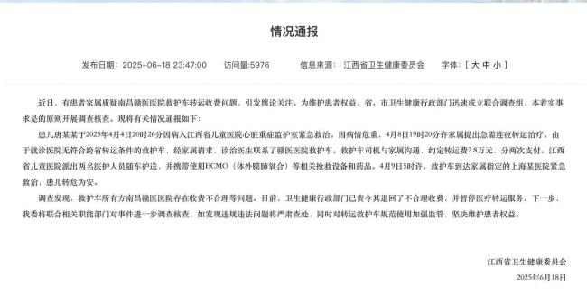 据江西省卫健委通报,江西省儿童医院当时没有符合跨省转运条件的救护车,主治医生联系了赣医医院的救护车,医院派出两名医护人员随车护送,并携带了ECMO等相关抢救设备和药品。调查发现,赣医医院存在收费不合理的问题,相关部门已责令其退还不合理收费,并暂停其医疗转运服务,同时将进一步调查核实。