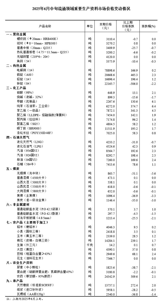 国家统计局:6月中旬流通领域重要生产资料27种产品价格上涨