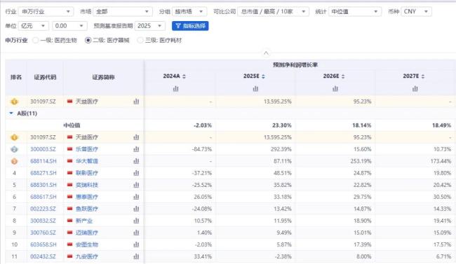 同花顺数据显示,截至6月15日,33只个股预测2025净利润增长率超过1000%。其中,天益医疗以13595.25%的净利润增长率高居榜首。
