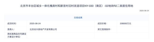 6月24日,北京市丰台区一宗住宅用地以底价20.8亿元成交。该地块为丰台区城乡一体化槐房村和新宫村旧村改造项目NY-030(南区)-02地块,用地性质为R2二类居住用地,土地出让面积25897.21平方米,规划建筑面积51794平方米,容积率2.0,起始楼面价40159元/平方米。