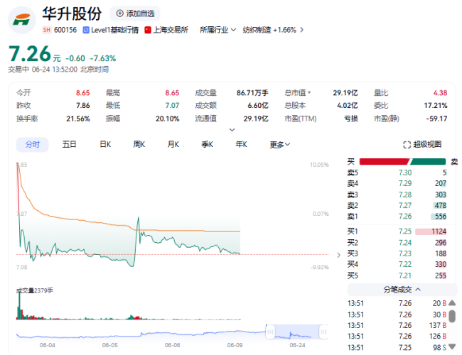 6月24日,华升股份(600156)开盘涨停,开于涨停价8.65元/股。开盘后公司股价迅速跳水,盘中一度跌近9%。