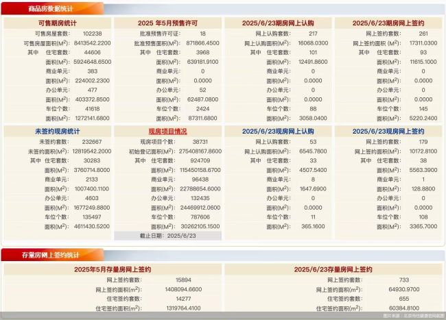 北京市住建委官网数据显示,6月23日北京新房网签440套,网签面积27483.84平方米,其中住宅网签131套,网签面积17178.49平方米;二手房网签733套,网签面积64390.97平方米,其中住宅网签655套,网签面积60384.81平方米。