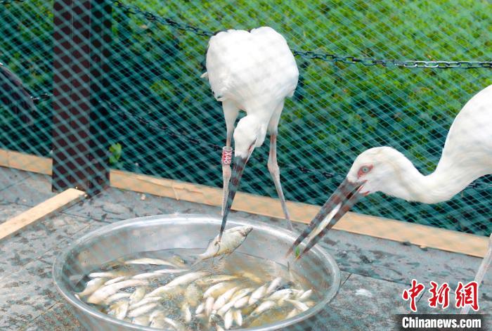 救助人员精心喂养东方白鹳。顾锋明 摄