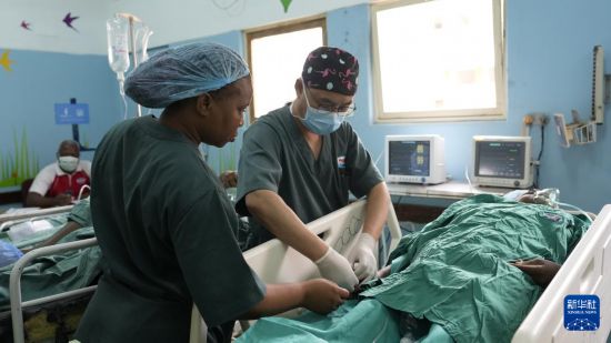 4月11日,在莫桑比克马普托,中国援莫医疗队医生凌勇(右)和当地医护人员对病人进行术后护理。新华社记者 刘杰 摄