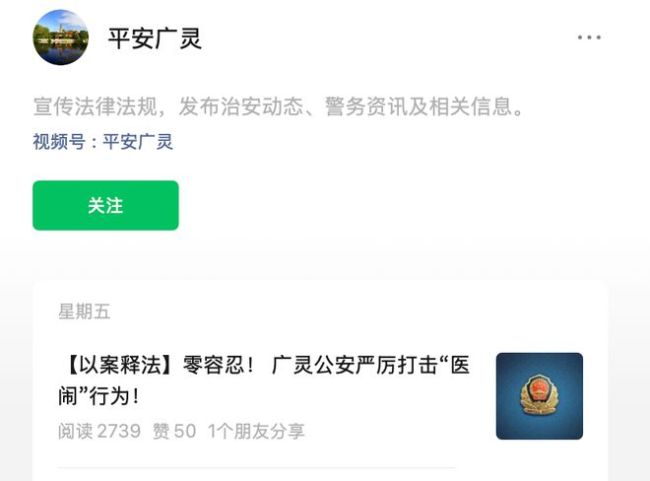 6月27日,山西省大同市广灵县公安局通过微信公众号“平安广灵”通报了一起“医闹”事件。该事件涉及8名患者家属,其中2人被行政拘留15日,6人被给予行政警告处罚。