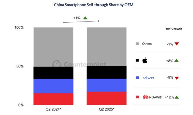 Counterpoint的数据显示,华为第二季度的销售额同比增长了12%,成为中国市场份额最大的公司,其次是Vivo,第三位是苹果。Counterpoint高级分析师Ivan Lam指出,随着核心用户的旧手机纷纷换新,华为的用户忠诚度仍然很高。