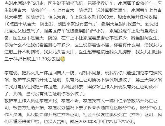 张女士称,院方提供的转运刘丽丽的“救护车”并未取得医疗机构执业许可证。在转运途中,“救护车”多次停车,且驶下高速加氧气。最终,刘丽丽在转运途中去世。家属原本想坐飞机,但医生说只能坐救护车。家属雇了一台救护车,医生却推荐吉大一院的救护车,车上有吉大一院标识,让家属信以为真。车上医生收了10000元,没给家属开任何收据。从吉大一院出发后,到四平就没有氧气了,延误大量时间找氧气,到沈阳北官站又没氧气了,服务区停车吃饭延误时间半小时。家属发现车上没有急救设备,医生也不是吉大一院的,在车上不让家属看患者心率。