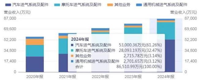 目前,主营业务由汽车进气系统及配件、摩托车进气系统及配件以及通用器械进气系统及配件组成,其中汽车进气系统及配件业务营收占比近60%,摩托车进气系统及配件业务营收占比近30%。