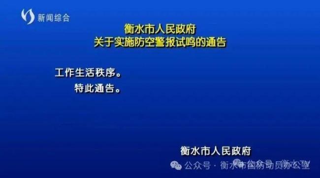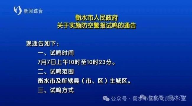 石家庄市人民政府决定于2025年7月7日上午10时00分至10时23分在市区及其他县(市、区)城区组织实施防空警报试鸣活动。此次试鸣将发放预先警报、空袭警报和解除警报三种信号,每种信号各发放一次,间隔7分钟。具体时间为: