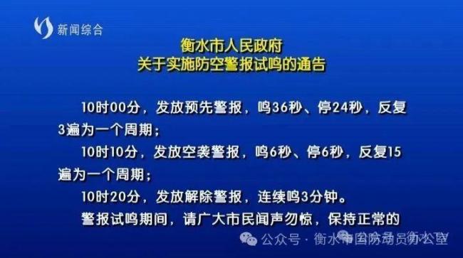 - 预先警报:10时0分开始,鸣36秒,停24秒,反复3遍,共3分钟; - 空袭警报:10时10分开始,鸣6秒,停6秒,反复15遍,共3分钟; - 解除警报:10时20分开始,连续长鸣3分钟。