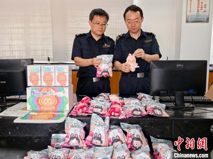 据介绍,凤岗海关关员在对一批申报为“玩具零件”的出口货物进行查验时,发现一批带有“POP MART”(泡泡玛特)商标的“LABUBU”盲盒玩偶。发货人无法提供相关授权证明,现场关员初步判断该批货物涉嫌侵权。经联系,权利人认为该批货物侵犯其在海关总署备案的商标专用权,并申请扣留货物。
