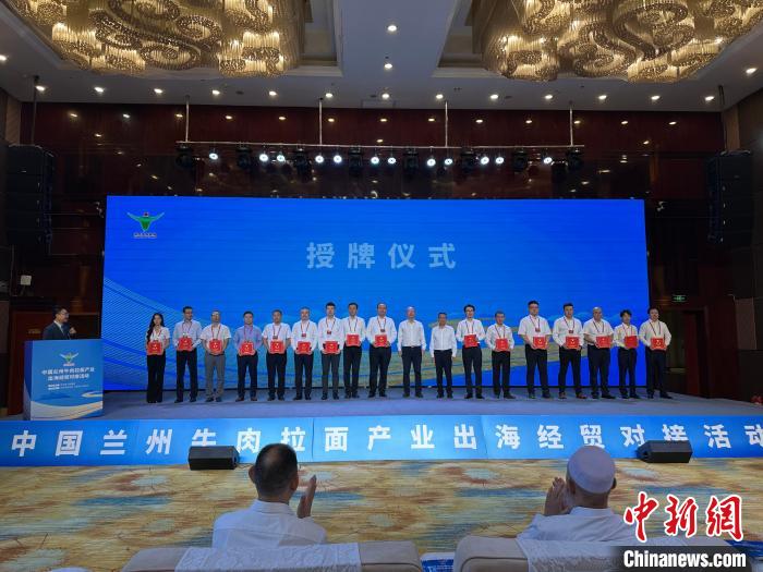 7月6日至10日,第31届中国兰州投资贸易洽谈会期间,“兰州牛肉拉面产业出海经贸对接活动”在兰州举办。图为授牌仪式现场。闫姣 摄