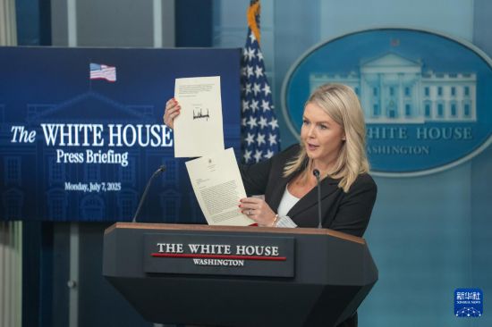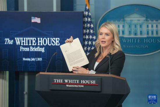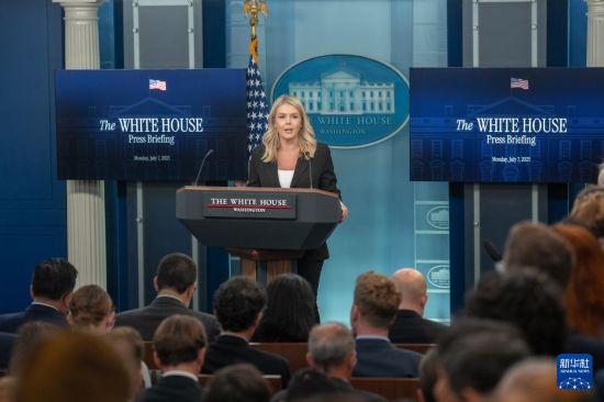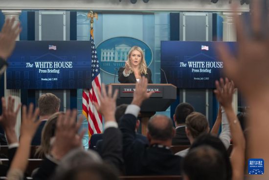 7月7日,在美国首都华盛顿白宫,白宫新闻发言人卡罗琳·莱维特出席记者会。新华社记者 胡友松 摄