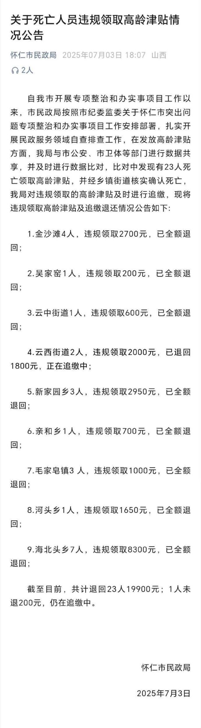 7月3日,怀仁市民政局发布了关于死亡人员违规领取高龄津贴情况的公告。自怀仁市开展专项整治和办实事项目工作以来,市民政局按照市纪委监委的安排部署,扎实开展民政服务领域的自查排查工作。在发放高龄津贴方面,市民政局与市公安局、市卫体等部门进行了数据共享,并及时进行数据比对,发现有23名已故人员仍在领取高龄津贴。经乡镇街道核实确认后,市民政局对违规领取的高龄津贴进行了追缴。