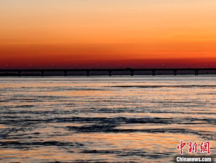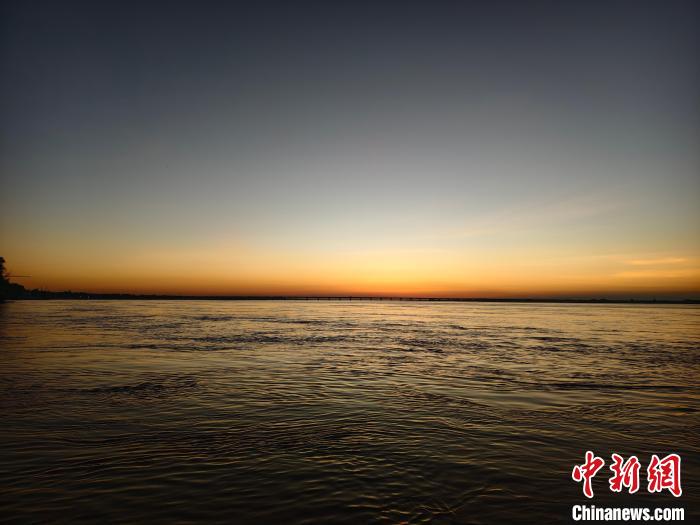 近日,位于河南郑州的黄河岸边,落日将天空与黄河染成一片暖色,水面波光粼粼,水上美景如画。图为落日余晖映晚霞。禹志超 摄
