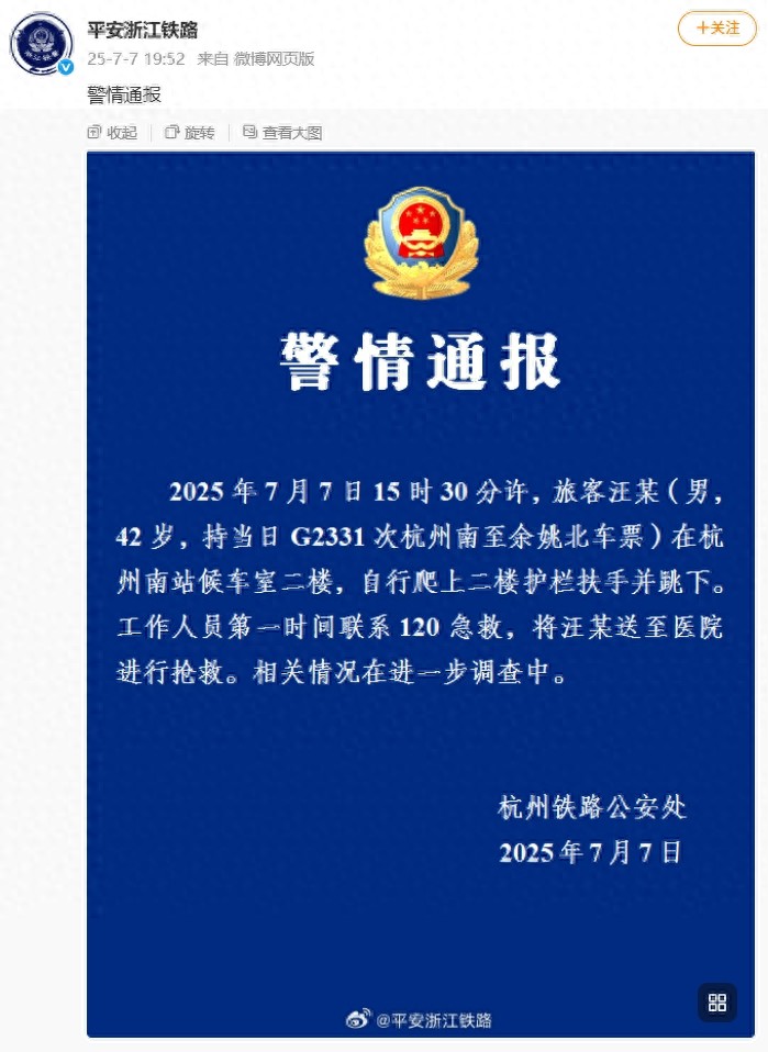 2025年7月7日15时30分许,旅客汪某(男,42岁,持当日G2331次杭州南至余姚北车票)在杭州南站候车室二楼,自行爬上二楼护栏扶手并跳下。工作人员第一时间联系120急救,将汪某送至医院进行抢救。相关情况在进一步调查中。