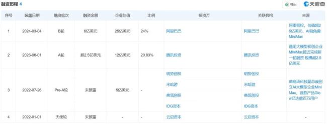 AI六小虎都可谓是“资本宠儿”。MiniMax身后站着红杉中国、阿里巴巴、腾讯、IDG资本、米哈游等股东,汇集了产业和机构中顶级的资本阵容。在2024年获得阿里巴巴领投的6亿美元融资后,MiniMax估值已经超过了25亿美元(折合人民币约179亿元);近期有媒体称其估值约30亿美元。