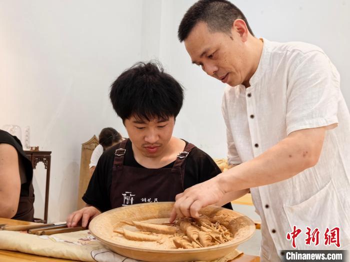 中新网金华7月10日电(张煜欢)走进位于浙江金华东阳木雕小镇的胡先民工作室,在刻刀与木料摩擦的沙沙声里,全国自强模范、浙江省工艺美术大师胡先民俯身于听障学徒张真飞旁,帮其细致调整切削力道。一刻一凿间,木屑簌簌飘落,一片片祥云打磨而出,师徒俩沉浸于手中的方寸天地。