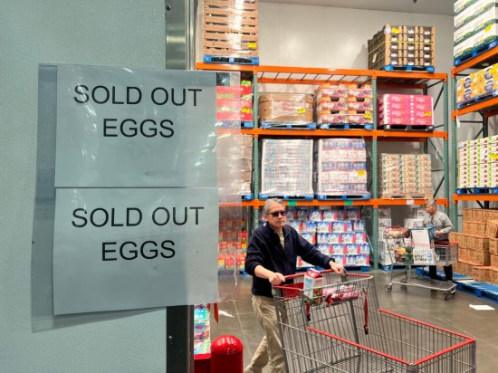 2月10日,在美国加利福尼亚州洛杉矶县一家超市内,顾客从鸡蛋售罄的通知旁走过。新华社发(曾慧摄)
