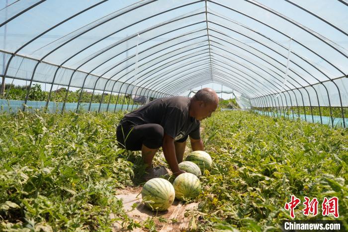 中新网湖北松滋7月10日电(吴淘淘 罗超伟)“我们的西瓜甜度高、味道好,每年都不愁销售。”10日,在松滋市滋宝西瓜专业合作社,瓜农庹圣柏掀开棚膜,托起一个近十斤重的无籽西瓜,指尖轻弹发出清脆回响。这批新鲜上市的西瓜即将发往四川、湖南等地。
