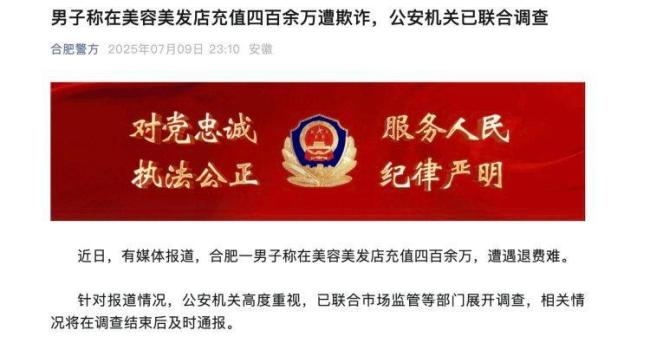 合肥警方发布通报称已展开调查。程先生在合肥一家理发店理发时认识了店长陈某,陈某邀请他在新店开业时去现场捧场。为了给朋友撑面子,程先生来到位于合肥经开区的合肥东方某美容美发店。从第一次到店起,美容师就通过卖惨、下跪等方式让程先生充值。两年多时间里,他陆续充值430多万元,其中2025年1月16日单次充值金额高达38.8万元。理发店为程先生安排的项目包括按摩、灌肠和针刺排毒等,仅一个疗程的灌肠项目就在30万元左右。程先生在做项目中出现身体不适后才发现,该理发店经营范围仅有理发服务,并不包括养生等内容,且门店没有行医资质。
