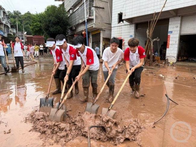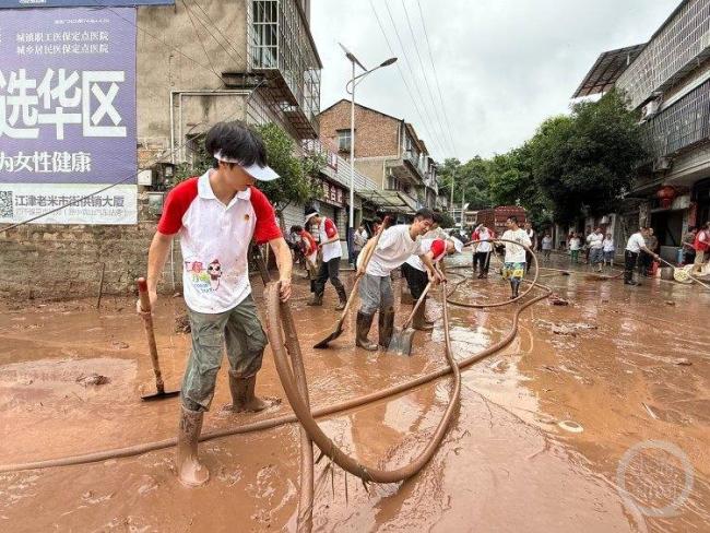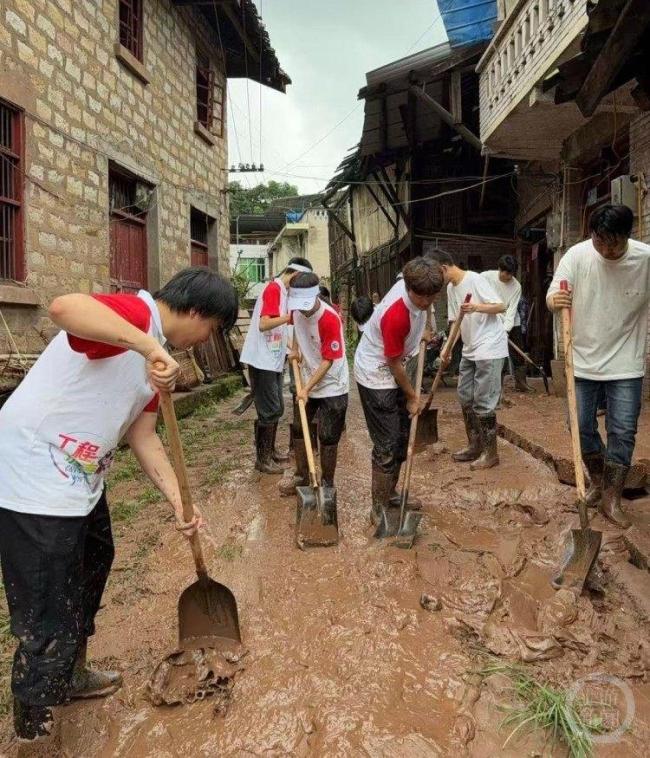 学生们原本计划探访革命前辈故居,并在村里进行反诈宣讲和防溺水宣讲。当他们到达双岔村时,发现村民们正在进行清淤工作,现场一片忙碌。因为镇上和村里不少人参与了中山古镇的清淤工作,村里只有十几名村民在清淤,但洪峰过境留下的淤泥量很大,十几名村民完全忙不过来。“三下乡”团队主动找到村主任询问是否需要帮助,村主任得知有这么多大学生前来帮忙非常高兴。十几名师生迅速领取了胶靴、手套、铲子等工具,立即加入清淤工作中。带队老师江希表示,虽然这次活动与原计划不同,但她认为这是一堂非常好的劳动实践课。