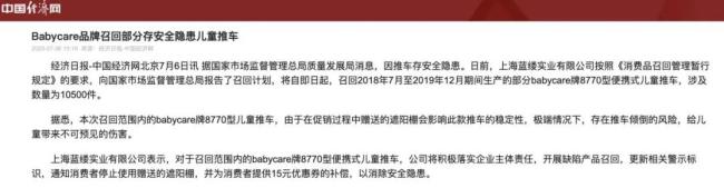 2020年,因推车存安全隐患,上海蓝缕实业有限公司按照《消费品召回管理暂行规定》的要求,向国家市场监督管理总局报告了召回计划,将自即日起,召回2018年7月至2019年12月期间生产的部分Babycare牌8770型便携式儿童推车,涉及数量为10500件。