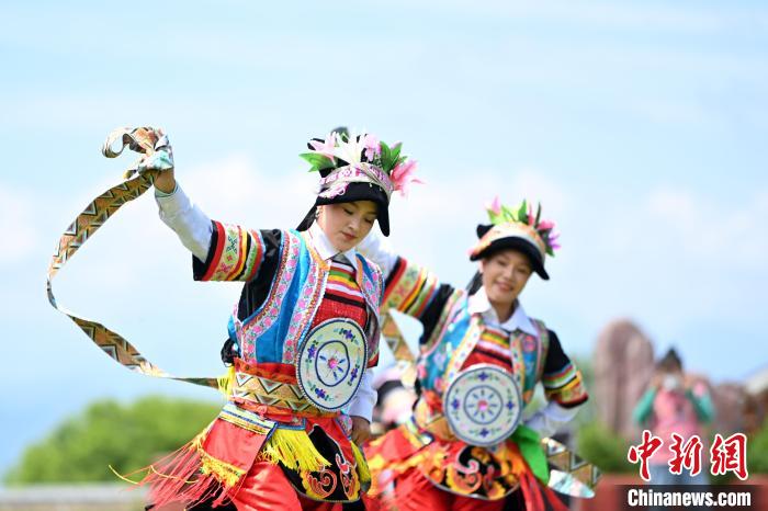 图为7月13日,工作人员在“簪花之路”途经的“三生三世”景区表演节目。九美旦增 摄