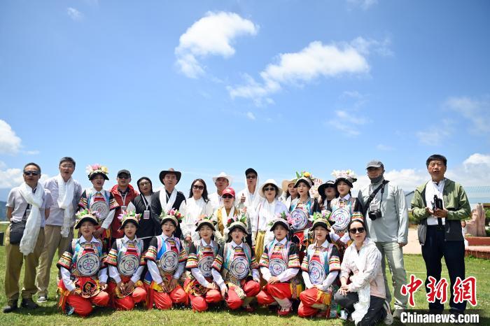 图为7月13日,在舟曲拉尕山上,2025海外华文媒体甘南行采访团成员与身穿传统博峪服饰的藏族女孩们合影留念。九美旦增 摄