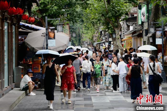 7月15日,四川成都,游人走在窄巷子。时下正值暑期旅游旺季,成都市宽窄巷子景区迎来众多游客前来游玩、打卡。中新社记者 王磊 摄