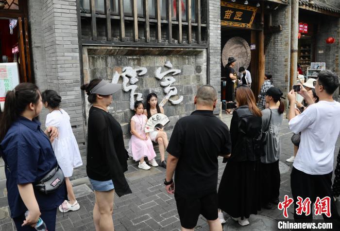 7月15日,四川成都,游人在宽巷子拍照。时下正值暑期旅游旺季,成都市宽窄巷子景区迎来众多游客前来游玩、打卡。中新社记者 王磊 摄