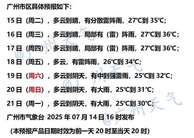 广东省气象台预计,7月15日至17日,广东将持续高温伴有分散(雷)阵雨,局部可能出现(大)暴雨,大部分市县最高气温将在34~37℃之间,部分地区还可能伴有8级左右的雷雨大风。广州市气象台也表示,未来几天广州将以高温炎热为主,午后局部有雷阵雨。