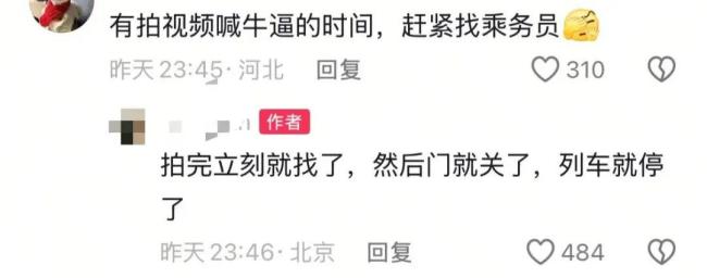 该网友在评论区表示,在拍完视频后立即联系了乘务员,随后车门被关闭,列车也停了下来。不过,截至发稿前,记者尝试私信该网友但未获回复。目前尚不清楚事件发生的具体时间和地点。