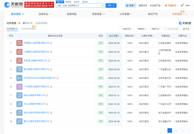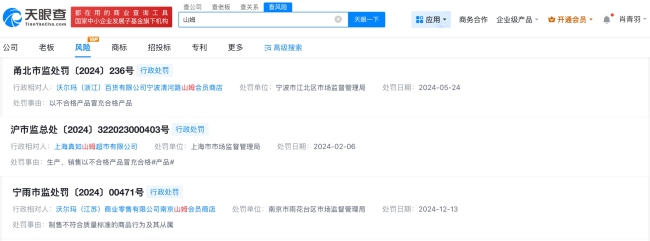 据报道,山姆会员商店的选品问题引发广泛关注,不少网友吐槽山姆下架了太阳饼、米布丁、低糖蛋黄酥等回购率高、性价比高的商品。同时,对其新上架的低糖好丽友派、溜溜梅等商品表示不满意,质疑山姆选品质量下滑。公开信息显示,山姆是沃尔玛旗下的高端会员制商店。第三方投诉平台显示,“山姆”关键词涉及11492条投诉。天眼查App显示,山姆(上海)投资有限公司成立于2021年5月,法定代表人、董事长为MUK SOOK YEE,注册资本3000万美元,该公司直接持有24家企业股权,均为存续状态。从成立时间看,山姆(上海)投资有限公司今年对外投资7家公司,注册资本合计2100万美元,涉及广东、北京、江苏等地。风险信息显示,山姆关联公司上海真如山姆超市有限公司、沃尔玛(浙江)百货有限公司宁波清河路山姆会员商店等现存多条行政处罚信息,处罚事由包括以不合格产品冒充合格产品;生产、销售以不合格产品冒充合格产品;制售不符合质量标准的商品行为及其从属等。