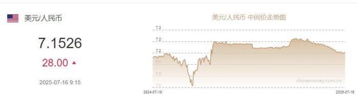 7月16日人民币对美元中间价报7.1526元 下调28个基点