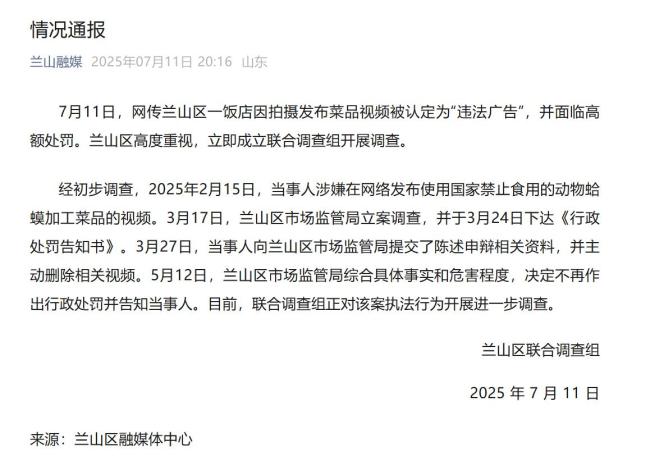 《情况通报》提到,2025年2月15日,当事人涉嫌在网络发布使用国家禁止食用的动物蛤蟆加工菜品的视频。3月17日,兰山区市场监管局立案调查,并于3月24日下达《行政处罚告知书》。3月27日,当事人向兰山区市场监管局提交了陈述申辩相关资料,并主动删除相关视频。5月12日,兰山区市场监管局综合具体事实和危害程度,决定不再作出行政处罚并告知当事人。
