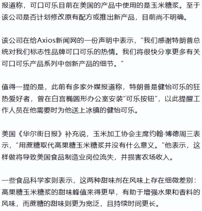 美国总统特朗普表示,可口可乐公司已同意在美国使用真正的蔗糖生产可乐。特朗普在社交平台上发文称,他一直在与总部位于亚特兰大的可口可乐公司就使用蔗糖事宜进行沟通。这一做法已在墨西哥版可乐中采用。他在文中感谢了可口可乐的所有高层,并认为这是非常正确的一步,会带来更好的结果。