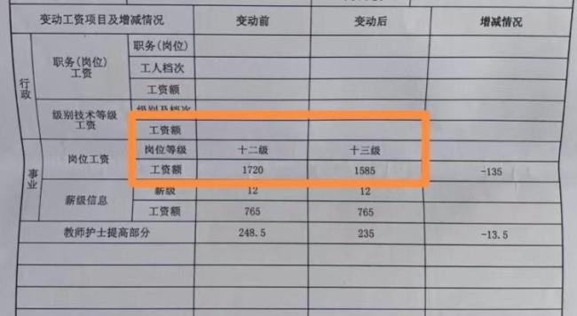 韦某某提供的工资明细显示,从2025年1月开始,她按照调整后的十三级岗位领取工资,与十二级相差100多元。她表示,虽然岗位工资差额不多,但影响了其他方面的待遇,如教护龄津贴、社保缴费基数等。此外,降级还可能被外界误认为教学能力不足或师德师风有问题。