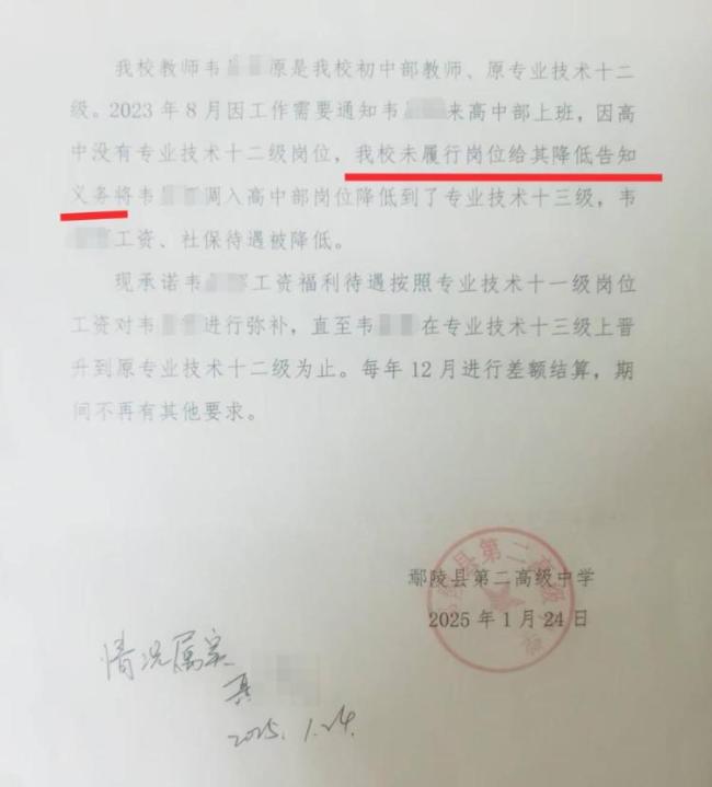 鄢陵县第二高级中学承认未履行岗位给其降低告知义务,并承诺对韦某某的工资福利待遇进行补差。鄢陵县教体局则要求校方按标准补发工资差额,并尽快恢复其岗位职级。然而,韦某某表示,事发至今已经过去数月,工资仍未见“补差”,岗位等级问题也未能解决。
