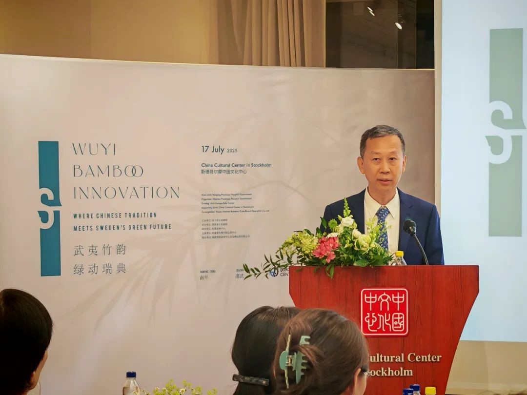 中国驻瑞典大使崔爱民大使出席中国·南平“武夷竹立方”推介会并致辞。中国驻瑞典大使馆供图