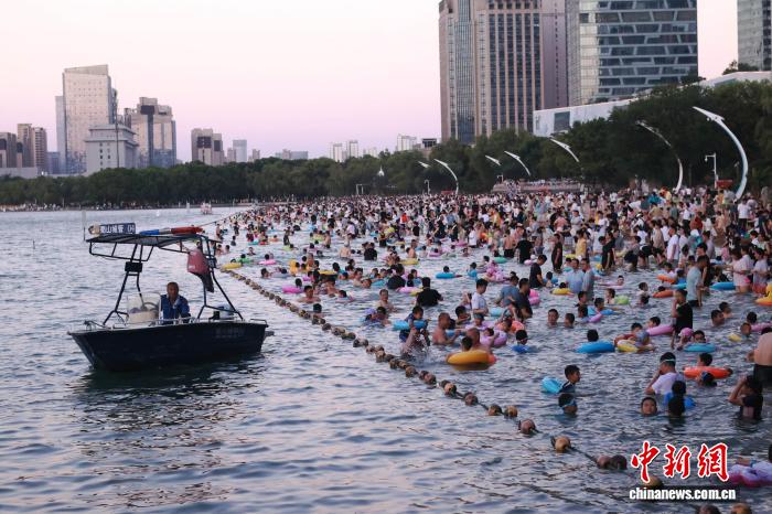 7月20日,安徽合肥市民在天鹅湖畔纳凉消暑。连日来,合肥持续高温。每到傍晚,天鹅湖沙滩、安全水域成为当地市民纳凉避暑的首选。张强 摄
