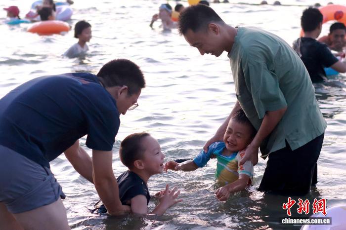 7月20日,安徽合肥市民在天鹅湖畔嬉水。连日来,合肥持续高温。每到傍晚,天鹅湖沙滩、安全水域成为当地市民纳凉避暑的首选。张强 摄