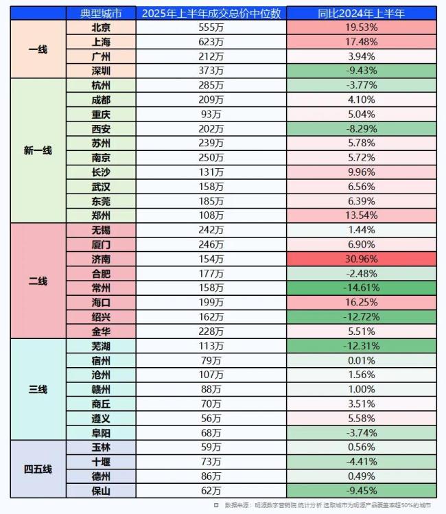 据明源数字营销院显示,一线、新一线、强二线城市的成交总价中位数较去年有上涨,平均上涨幅度为5-20%不等。其中北京上海涨幅最高,达到了17-20%。