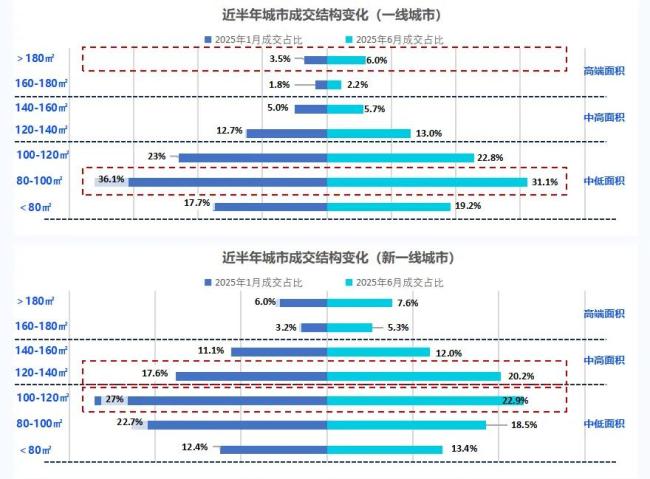 比如,上半年一线城市中,180㎡以上的产品同比提升了3%左右,而像新一线城市的120-140㎡的产品也上涨了3%。