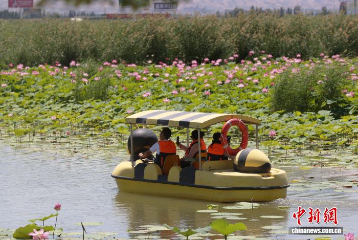 7月20日,宁夏银川,市民在鸣翠湖国家湿地公园内赏荷拍照。盛夏时节,宁夏银川市鸣翠湖国家湿地公园的荷花竞相开放,为湿地增添美丽景观,吸引游客前来打卡拍照。中新社记者 于晶 摄