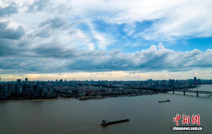 图为武汉城市上空蓝天与乌云同现,宛如大自然绘就的“阴晴交界图”。中新社记者 张畅 摄