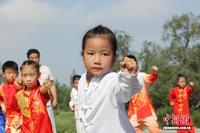 图为7月24日,沧县曹庄子小学学生在大运河畔学习传统武术。田博 摄